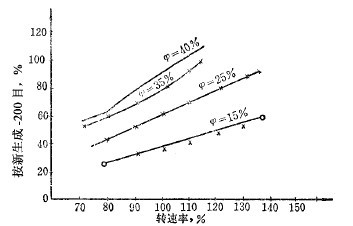 超臨界轉(zhuǎn)速運(yùn)轉(zhuǎn)不僅在理論上突破了公式(2-5)的局限性,而且可以提高磨機(jī)的處理能力。生產(chǎn)實(shí)踐指出,如果應(yīng)用恰當(dāng),超臨界轉(zhuǎn)速運(yùn)轉(zhuǎn)可以提高磨機(jī)的生產(chǎn)力,雖然功率耗相應(yīng)地增加,但比功率耗(即千瓦·時(shí)/噸)常常是降低的,如下表中的例子。磨機(jī)的轉(zhuǎn)速和裝球量是影響磨機(jī)生產(chǎn)率的兩個(gè)關(guān)鍵性的因素。超過nc值運(yùn)轉(zhuǎn)固然可以提高磨機(jī)生產(chǎn)率,但要求減少裝球量,而減少裝球量又會(huì)使生產(chǎn)率降低。所以不能片面地采用大幅度提高轉(zhuǎn)速及大幅度減少裝球量的辦法,這反而會(huì)使生產(chǎn)率下降,如下圖3-2-6反映的情況。當(dāng)裝球率減少到25%以下,即使將轉(zhuǎn)速率提高到145%,生產(chǎn)率也達(dá)不到裝球率為35~40%,(轉(zhuǎn)速率為110~120%的。并且轉(zhuǎn)速太高,磨機(jī)振動(dòng)很厲害,也會(huì)造成危險(xiǎn)。