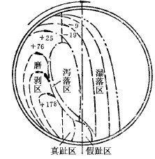 如圖所示,新給礦中的小粒,由給料端進入,沿A面均勻地落于筒體底部中心,然后向兩側(cè)擴散。大塊具有較大的動能,總是趨向較遠的一側(cè),但其中有一部分必然要和AB面相碰,然后向另一側(cè)返回,因之,也使大塊得到均勻分布。A——A、B——B 在這里的作用是防止給入物料有害的偏析。自排礦端沿下面返回的顆粒如同新給料中的細粒一樣,均勻地落于筒體底部的中,然后向兩邊擴散。大塊和細粒在筒體底部沿軸向運動,方向正好相反,于是產(chǎn)生磨剝作用。