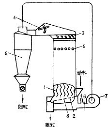 圖2所示的上升氣流風(fēng)力分級(jí)機(jī)(附旋風(fēng)集塵器),呈方形的分級(jí)室內(nèi),裝有若干近于平行的豎直“之”字形導(dǎo)板1。從料斗給到篩板2上的物料,在下部供入的上升氣流作用下,被帶到分級(jí)室中,經(jīng)過(guò)彎曲的導(dǎo)板上行過(guò)程中,粗的礦粒落下與未過(guò)篩的粗粒一起排出,為粗粒產(chǎn)物。細(xì)的礦粒經(jīng)上部通道入旋風(fēng)集塵器分離,得細(xì)粒產(chǎn)物。集塵器上部排出的氣流,又回到風(fēng)機(jī),循環(huán)使用,或者從孔6中排走。