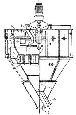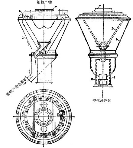 通過(guò)式離心分級(jí)器(見(jiàn)圖3),主要用于與干式磨機(jī)閉路工作。設(shè)備主要由外錐1和內(nèi)錐2組成,上部裝有導(dǎo)向葉片5,使由內(nèi)外錐之間上來(lái)的氣流呈切線(xiàn)進(jìn)入內(nèi)錐。磨機(jī)產(chǎn)物與氣流一起從底部管道中以大約18~20米/秒的速度向上供入,進(jìn)入內(nèi)外錐之間的環(huán)形空間后,因過(guò)流斷面變大,速度降至4~6米/秒,于是,粗的礦粒落下,由管4中排出,返回磨機(jī)再磨。其他礦粒被氣流帶著往上行,經(jīng)葉片5,呈切線(xiàn)進(jìn)入內(nèi)錐,產(chǎn)生回旋運(yùn)動(dòng)。在慣性離心力作用下,較粗的礦粒被拋到內(nèi)錐壁上,然后下落,由排礦管6排出。這種產(chǎn)物或作為產(chǎn)品,或者返回磨機(jī),視情況而定。細(xì)礦粒隨氣流從頂部管道中排出,至集塵器中收集,為細(xì)粒產(chǎn)物。