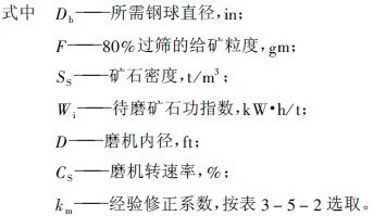 式(5-2)不能直接使用,必須針對(duì)特定礦石作兩組試驗(yàn),列出兩個(gè)方程式成一組,從方程組求解出i及n才能得出特定的球徑方程式,方可應(yīng)用。為了方便應(yīng)用,K.A拉蘇莫夫提出,對(duì)中硬礦石可以直接使用下面的簡便計(jì)算式計(jì)算Db(mm)