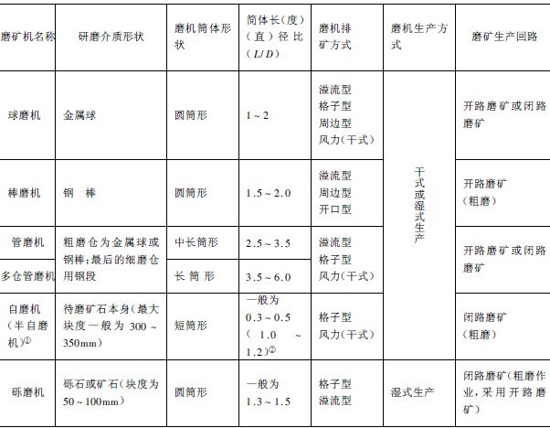 各類磨機(jī)的主要類型和圓筒型磨機(jī)的分類方法,分別如圖1 和表1所示。
