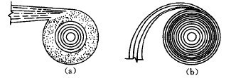 給礦口的大小對處理能力、分離粒度以及分級效率均有一定影響。其直徑常與旋流器直徑呈一定比例,大多dc=(0.08~0.25)D。給礦口的橫斷面形狀以矩形為好。而縱斷面常為圖3-4-19(a)所示的切線形。由于這種進(jìn)料方式易使礦漿在進(jìn)入旋流器時與器壁沖擊產(chǎn)生局部旋渦影響分級效率。因此出現(xiàn)了如圖3-4-19(b)的漸開線形及其他型式的給礦管。