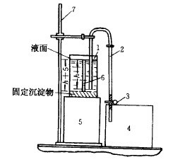 淘析法水析裝置也稱薩巴寧沉降分析儀,如圖3-4-12所示。淘析過程是在一個直徑為70~100mm、高度為150~170mm的玻璃杯1中進(jìn)行的。杯內(nèi)裝有一根直徑約為6~10mm的虹吸管2。虹吸管的短管部分應(yīng)插入杯內(nèi),使其管口下端距固體沉淀物料面留有5mm的距離。虹吸管另一端帶有管夾3,插入到溢流收集槽4內(nèi)。