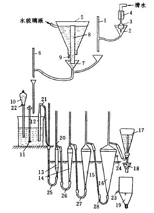 這種連續(xù)水析器一次可獲得多級產(chǎn)品,操作簡便,只要保持工作正常(及時放出管內(nèi)氣泡且不使礦粒堵塞膠管),所得結(jié)果就較為準(zhǔn)確,但水析時間較長。
