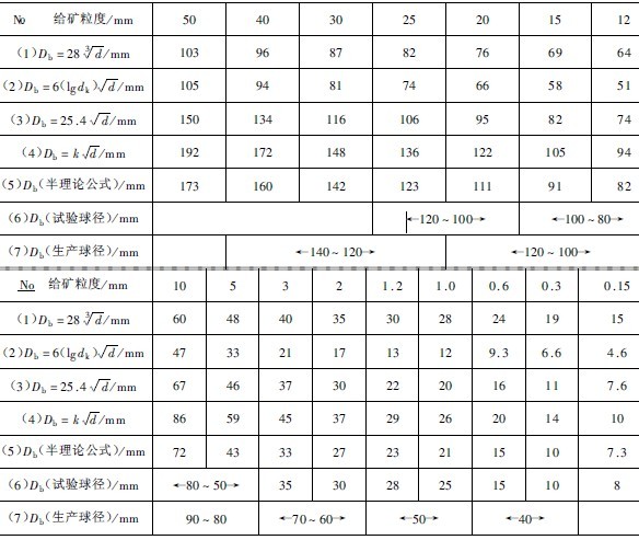球徑半理論公式初步的驗證分析可以采取計算結(jié)果比較分析的辦法。由于各個常見的球徑經(jīng)驗公式均為選礦工作者們所用過,并對它們的準(zhǔn)確性和適用范圍作了一些結(jié)論,因此,可以將球徑半理論公式和各個常見球徑經(jīng)驗公式同時用于計算相同磨礦條件。