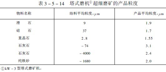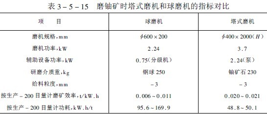 表3-5-14示出了利用塔式磨機(jī)磨碎不同物料獲得的產(chǎn)品細(xì)度,表3-5-15列出了利用球磨機(jī)和塔式磨機(jī)磨鈾礦石時(shí)的結(jié)果對(duì)比,從該試驗(yàn)結(jié)果可以看出按產(chǎn)生一噸小于200目物料所消耗的電能計(jì),塔式磨機(jī)比球磨機(jī)低一倍以上。