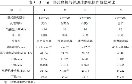 表3-5-16示出了美國(guó)科珀(Kopper)公司的某一子公司提供的塔式磨機(jī)與球磨機(jī)的工作性能對(duì)比結(jié)果,表中,例A、B是實(shí)驗(yàn)室試驗(yàn)結(jié)果;C是南方麥奇根煙氣脫硫系統(tǒng)磨機(jī)工作結(jié)果;D是裝在可蘭德湖拉卡礦業(yè)公司再磨回路中應(yīng)用情況,根據(jù)該公司的試驗(yàn)結(jié)果得出下述見解: