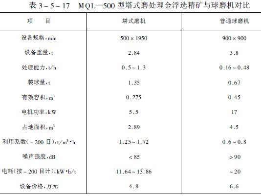 我國(guó)有關(guān)單位研制的MQL——500型螺旋攪拌塔式磨機(jī)也分干式、濕式兩種。濕式塔式磨機(jī)于1984年在大石河鐵礦選礦廠進(jìn)行過(guò)半工業(yè)試驗(yàn),后來(lái)在金廠裕金礦用作浮選金礦的再磨,以滿足該廠下步氰化浸出的要求。該廠采用一段塔式磨機(jī)可以將小于350目占64%的金浮選精礦磨細(xì)到小于350目占99.74%,磨機(jī)利用系數(shù)為0.485噸/米3時(shí),電能消耗為13.45千瓦/噸,鋼耗為4.65千克/噸,MQL——500型塔式磨機(jī)與球磨機(jī)工業(yè)試驗(yàn)指標(biāo)列于表3-5-17中。