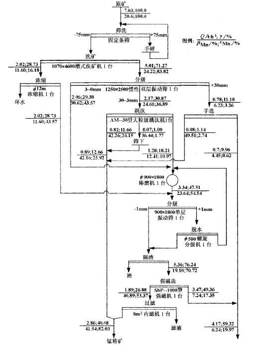 該錳礦選礦廠采用重選-強(qiáng)磁選-重選聯(lián)合選礦工藝。其工藝流程與選礦指標(biāo)見圖9-1-13所示。