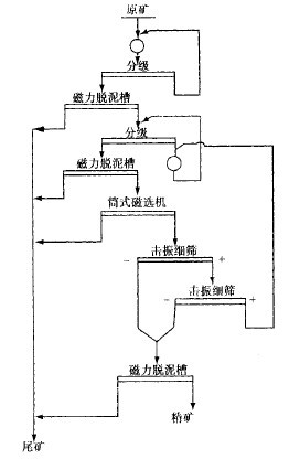 目前,我國有一些選礦廠應(yīng)用強(qiáng)磁場磁選機(jī)直接選別赤鐵礦或假像赤鐵礦,實(shí)踐證明,這是一種較好的有效方法。例如某選礦廠處理含磁鐵礦和赤鐵礦的礦石,應(yīng)用弱磁場磁選機(jī)和強(qiáng)磁場磁選機(jī)分別回收磁鐵礦和赤鐵礦。其工業(yè)試驗(yàn)流程如圖1所示。采用該流程達(dá)到的指標(biāo)是:原礦品位34.20%(FeO3.7%)時,精礦品位達(dá)56.46%Fe,回收率78.95%。