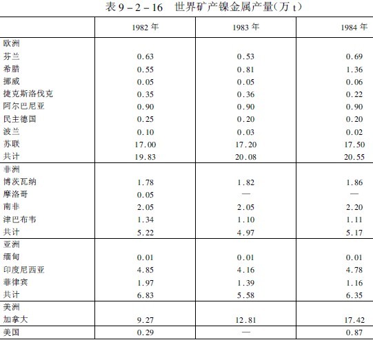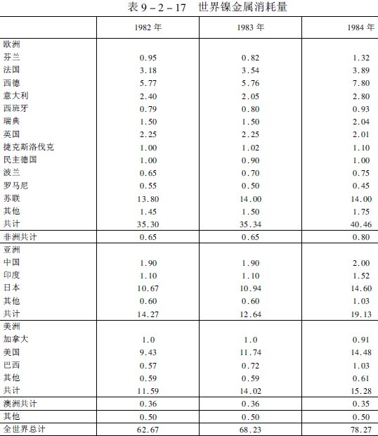 預(yù)計(jì),今后全世界的鎳總消耗量將以年平均2%的速度增長(zhǎng),近年來(lái),世界礦產(chǎn)鎳產(chǎn)量和鎳消耗量分別列于表9-2-16和表9-2-17。