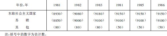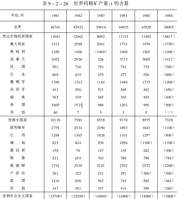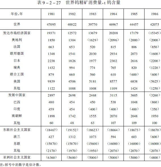 根據(jù)聯(lián)合國貿易和發(fā)展會議商品委員會鎢委會1986年11月第18屆會議報告資料,近幾年世界鎢精礦的產(chǎn)量和消費量分別列于表9-2-26及表9-2-27。
