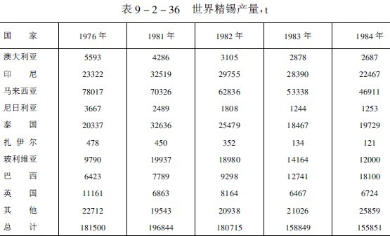 1976年以來,世界錫精礦含錫和精錫的產(chǎn)量列于表9-2-35和表9-2-36(不包括我國、蘇聯(lián)和東歐各國)