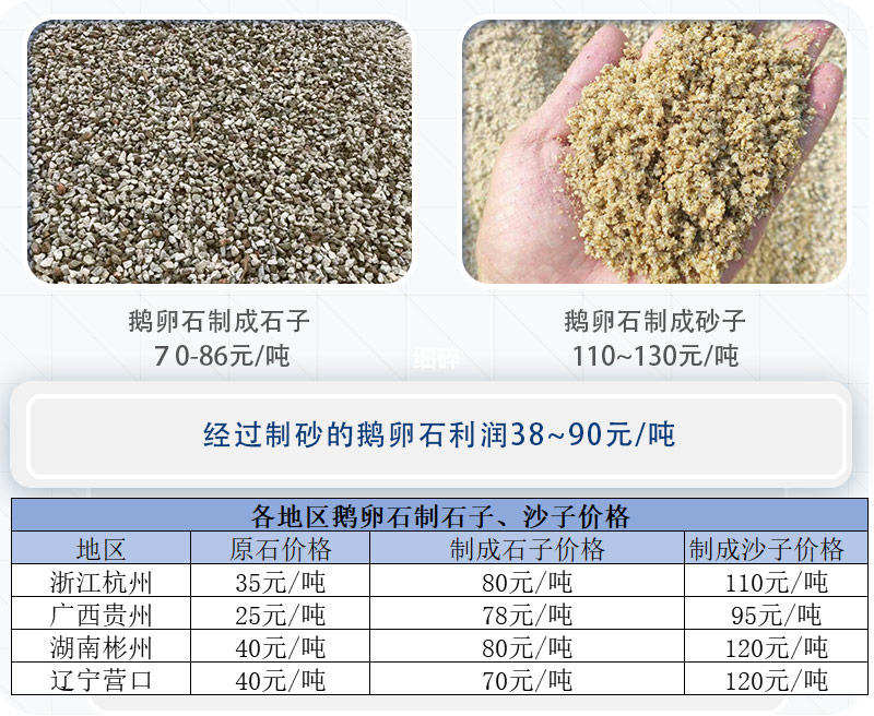 鵝卵石制的沙就是行業(yè)內(nèi)常說的機(jī)制砂,其每個地區(qū)的價格都會有所差別,且還會隨著市場的需求而波動,并沒有固定的數(shù)字,但是從砂石骨料網(wǎng)在六月中詢統(tǒng)計的數(shù)據(jù)中得知,大部分地區(qū)鵝卵石制成的石子價格,鵝卵石制成的沙子價格在95-120元/噸不等。對比制砂前每噸25-40元左右的鵝卵石價格,其中的利潤是比較可觀的。
