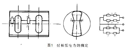 為了測(cè)定肘板的壓應(yīng)力,在肘板的較小截面處布置2~3組測(cè)點(diǎn),如下圖1所示。每組中的a、b兩枚電阻片串聯(lián),以測(cè)定壓應(yīng)力并消除彎曲應(yīng)力,各組并接以求出該截面應(yīng)力的平均值,并與數(shù)量級(jí)接線方式相同的溫度補(bǔ)償片組成半橋。