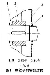 該型破碎機的輥子與機殼間的密封過去采用毛氈密封,其結(jié)構(gòu)見圖1。毛氈對空氣的密封效果不好,環(huán)境干燥,使用不久毛氈就會磨損,造成嚴重的漏灰現(xiàn)象。