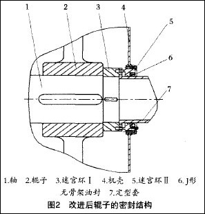 為了解決上述問題,對該密封結(jié)構(gòu)進行改進,采用迷宮密封及J形無骨架油封結(jié)構(gòu),其結(jié)構(gòu)見圖2。迷宮環(huán)I通過鍵聯(lián)接安裝在輥子軸上,迷宮環(huán)Ⅱ安裝在機殼上,這樣迷宮環(huán)I和迷官環(huán)Ⅱ組成了一組迷宮密封。在迷宮環(huán)的外側(cè)還安裝了l副J形無骨架油封。